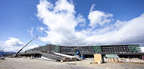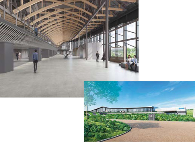 国道側からSMC遠野サプライヤーパークを眺めると、山の稜線のような屋根の共用棟、奥に広がる工場棟が目に飛び込んでくる。景観と一体化し、従来の工場施設の概念を変える〝環境共生型生産拠点〟を具現化した外観だ。