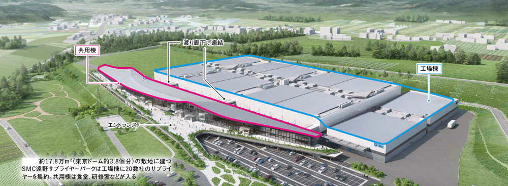 SMC株式会社は半導体や自動車、食品など製造業で欠かせない空気圧制御技術の世界的トップメーカーだ。サプライヤーパークとは、一つの敷地に多数の協力会社を誘致して、生産迅速化とサプライチェーンの強靱化を図る仕組みを整えたエリアのこと。ここ遠野で日本でも例を見ない独自の生産体制を構築する。