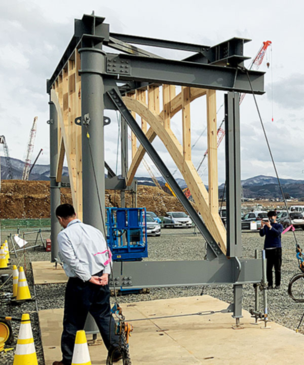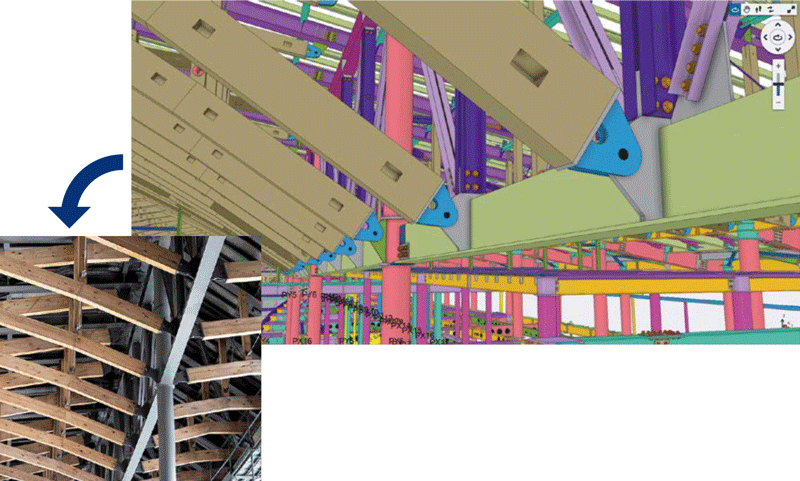 最も苦心したのが、木アーチと鉄骨の取り合い部分の施工だ。「意匠上、ボルトではなくピン接合としたためクリアランスがありません。整合させるためにモックアップを作成して検証を行いました。溶接時に鉄骨に歪みが生じることが分かり、施工前にしっかり是正することができました」と田上課長代理は振り返る。アーチ部分は、ヤードで地組みして取り付けを行ったが、その際も精度管理に万全を期した。「アーチを取り合う柱は1mmの傾きも許容されないので、誤差ゼロを目指した高度な精度管理を徹底しました。大いに役立ったのは『建て方反省会』です。職長のみならず、作業員全員に参加してもらい、その週の作業を振り返り、翌週に活かすPDCAを回していきました。そのおかげで、安全・工程・品質において問題なく進めることができました」と江刺家主任は笑顔を見せる。