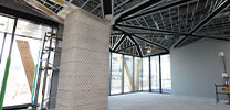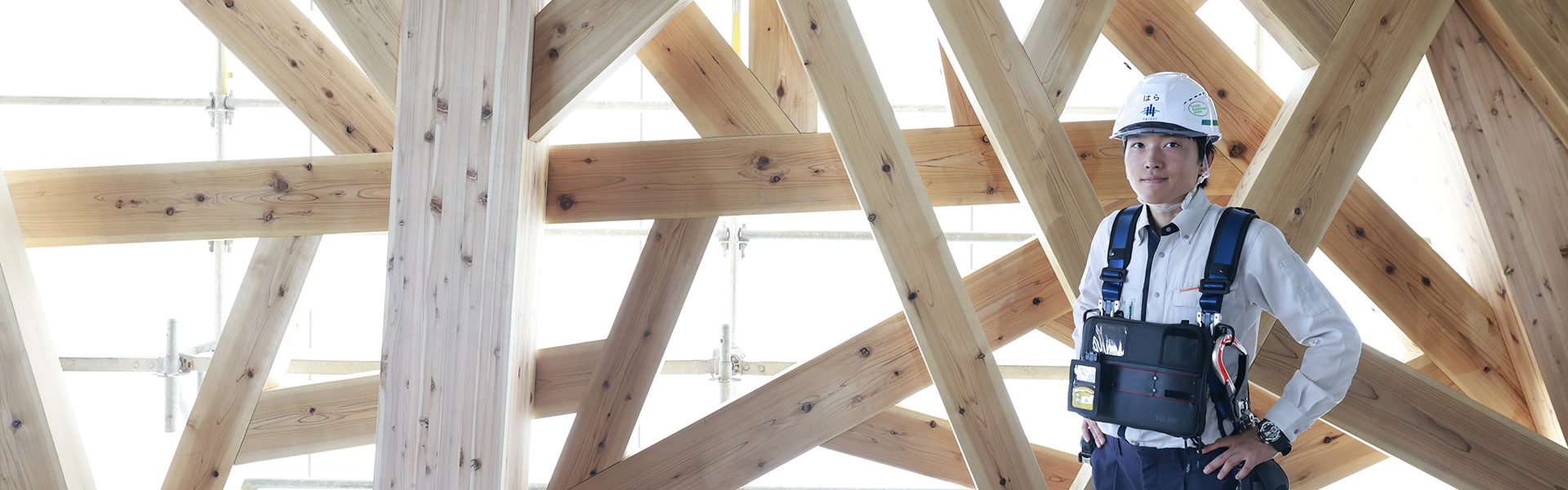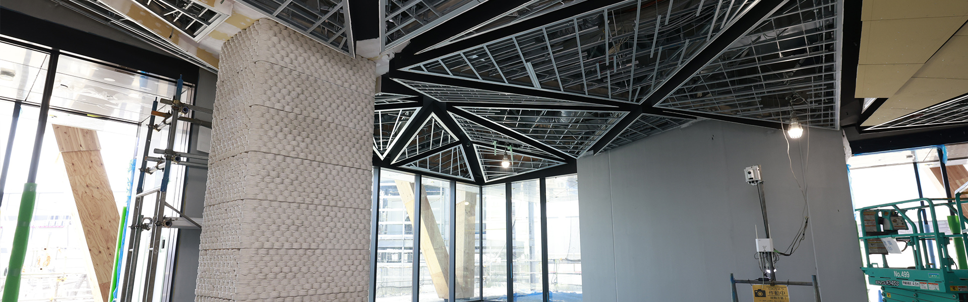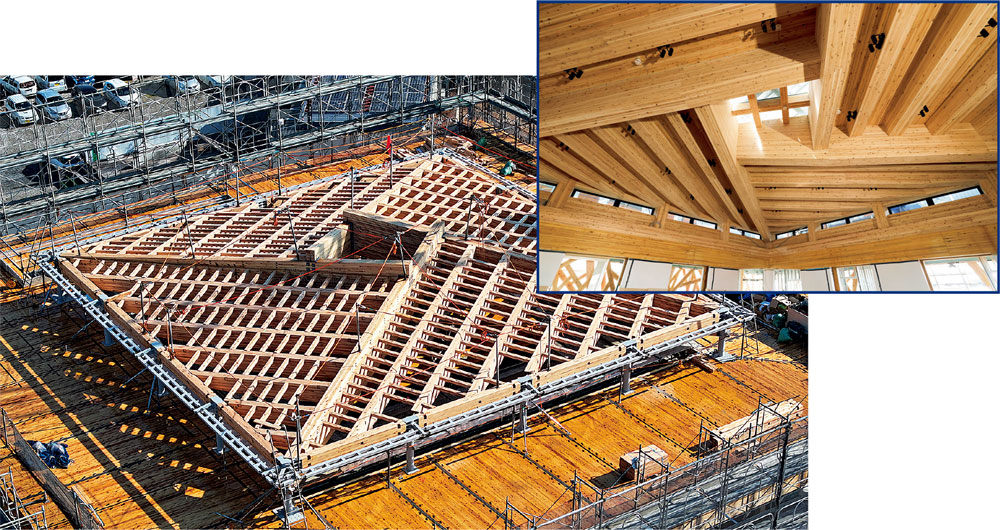 中央フレームは耐震梁を組み上げる前に柱に耐火被覆を先行して行う必要があり、慎重に施工を進めた。また、同じく木造の屋根は無柱の高天井空間を実現する「レシプロカル(相持ち)構造」で、四隅から中央へ向かう4本の梁が互いに支え合い、立体的に保つようになっている。3本目の梁までは上へ上へと重ねて組んでいけばよいが、4本目は1本目の下をくぐらせて3本目の上に載せなければいけない。「原設計では4本目の梁を横から差し込むのは不可能だったため、施工方法に合わせて柱の形状を変更することで、無事に組み上げることができました」と高橋圭課長は振り返る。