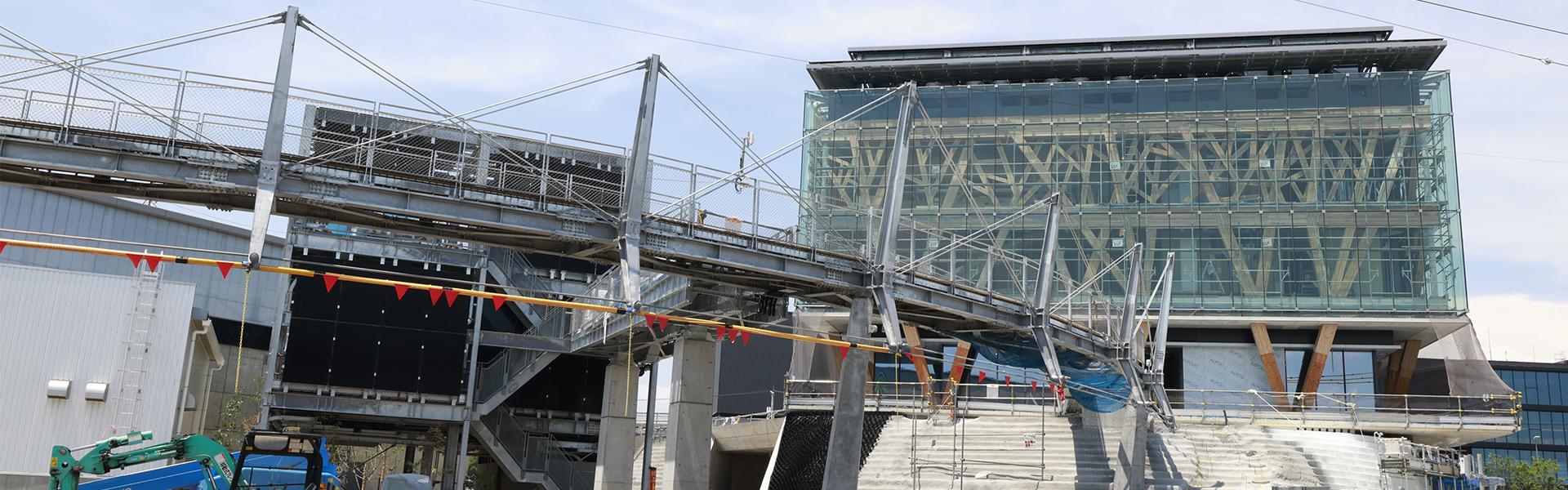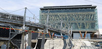 平面が馬蹄形をなすこのブリッジは、フランス・パリ郊外にある「ヴァルミー歩道橋」を参考に設計された。片側のみに支持部材を持つ特殊な斜張橋で、視界をさえぎらないこと、橋脚が細く、少ないことが特長だ。全周約180mに対し、ブリッジを支えるRC造の柱は7本しかない。高橋圭課長は施工方法を次のように説明する。「上部にある27本のそり柱にケーブルを取り付け、うち7カ所を下部のRC柱と接合します。接合部に球体のすべり支承を挟み、鉄骨をケーブル緊張時に動くようにしておくことがポイントです。最後に油圧ジャッキで外向きに力をかけてケーブルを緊張させ、反力によってそり柱を外側に倒します。広げた輪ゴムのように、広がったケーブルが元に戻ろうとする力で鉄骨が自立し、ブリッジ全体が安定する仕組みです」。