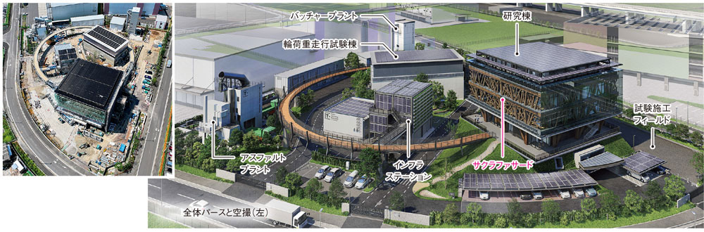 約11,000m2の敷地に研究棟、アスファルトプラント、バッチャープラント、インフラステーション、輪荷重走行試験棟、試験施工フィールドなどを配置。中でも注目を集めるのが、「ゼロカーボンビル(ZCB)*1」として建設が進む研究棟だ。