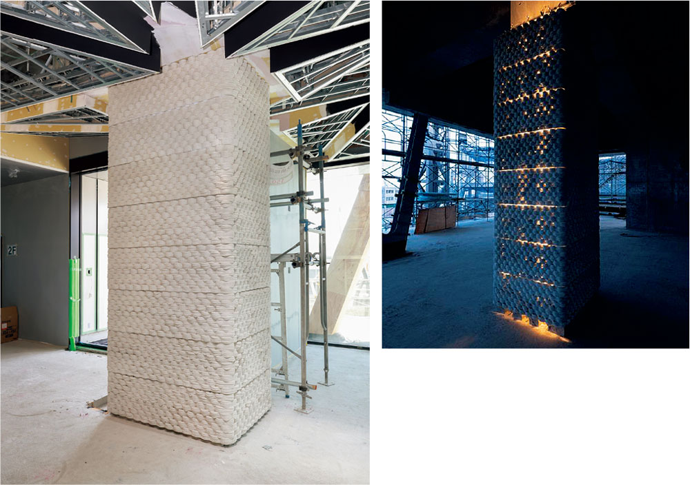 足場が取り外された研究棟のガラスカーテンウォールを透かして、複雑に交差する木の柱が見える。ここ埼玉県幸手市のシンボルである桜の枝をモチーフにした「サクラファサード」だ。自然の木と同様、ランダムに枝が伸びているように見えて、実は緻密に計算されたデザインだ。