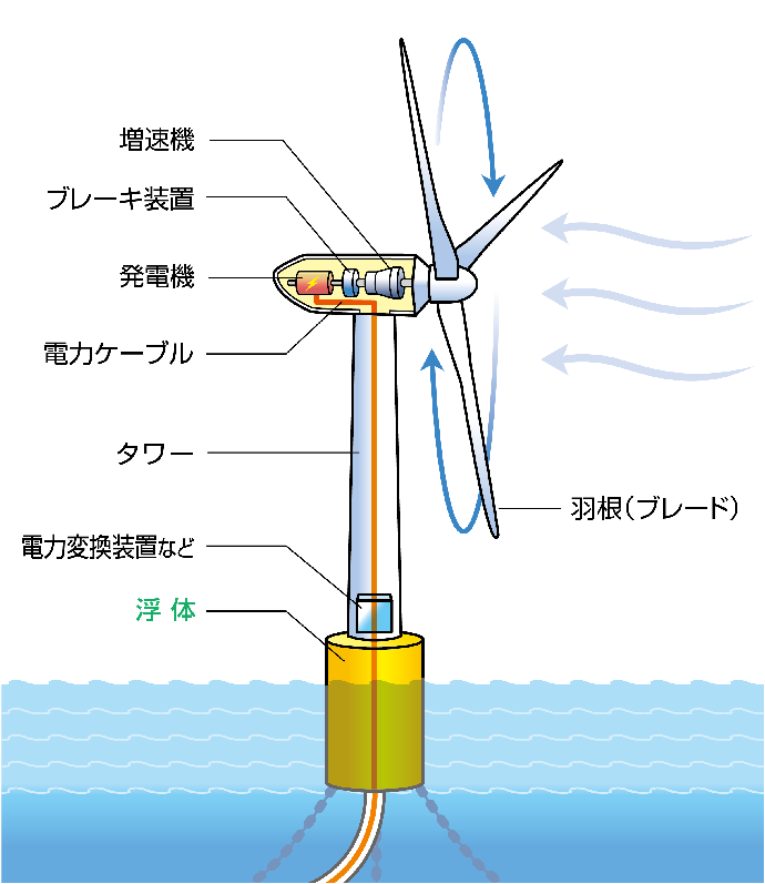 浮体式(ふたいしき)の風車は次のようなしくみになっています。