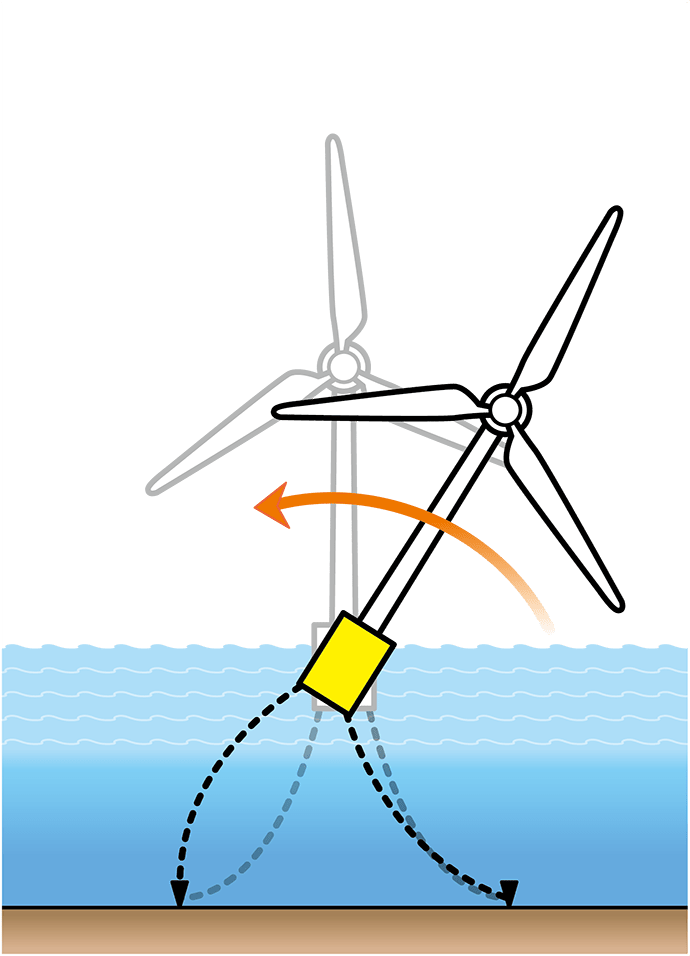 浮体に海の水をたくさん入れると風車全体がとても重くなり、ゆれにくくなります。重たい部分が下にあるので、「重さの中心」が下のほうにうつり、風車全体の重さは下向きにはたらきます。これにたいして、浮体を浮かせる力は「浮かせる力の中心」が水につかっている部分の真ん中より上にあり、上向きにはたらきます。海の上の風車はこれらの力がつりあうことで、ひっくり返ることなく安定して浮くことができます。